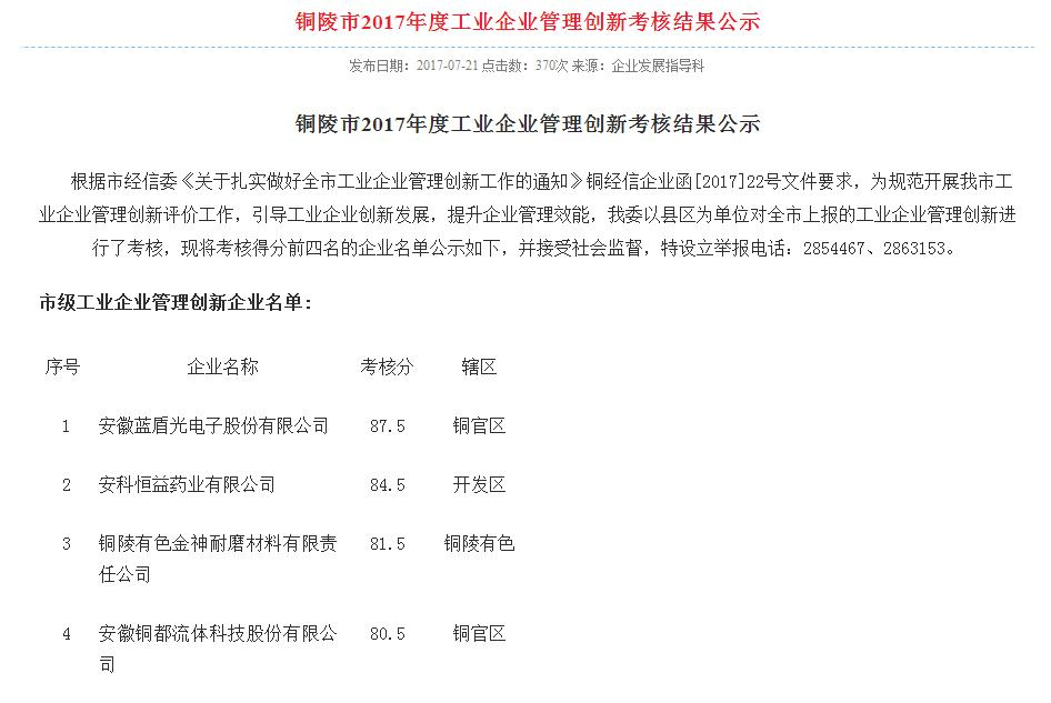 2017年度工業企業管理創新考核結果公示安科恒益榜上有名