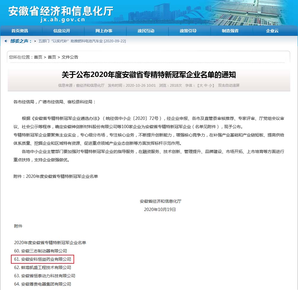 近日,安徽省經(jīng)濟(jì)和信息化廳公布了 2020 年度安徽省專精特新冠軍企業(yè)名單,我公司入選安徽省專精特新冠軍企業(yè)。
