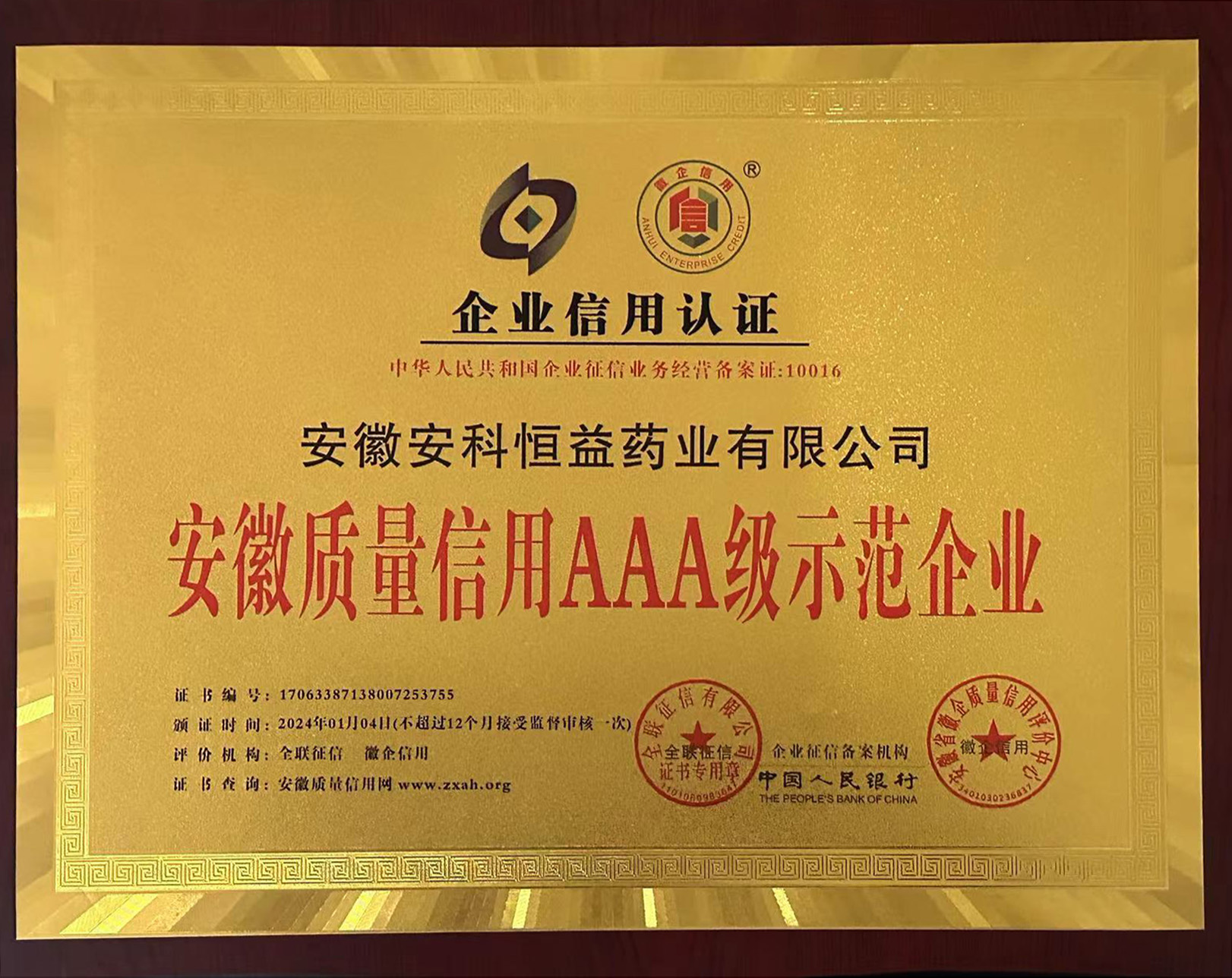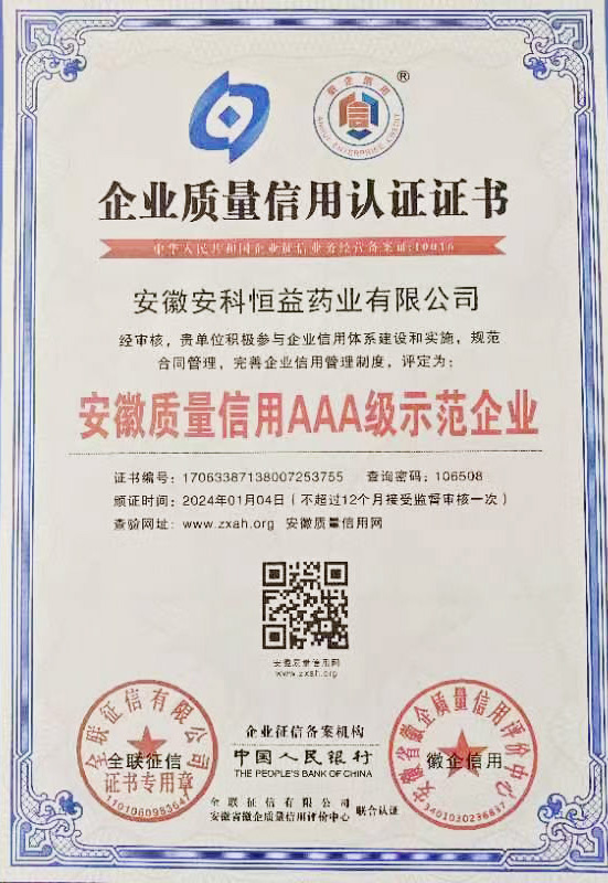 近日,安徽省徽企質(zhì)量信用評價中心和安徽企業(yè)信用等級評價專家委員會依據(jù)GB/T23794-2015《企業(yè)信用評價指標(biāo)》、Q/AH/HQXY001-2019《企業(yè)信用等級評價管理辦法》,針對我公司的信用記錄、經(jīng)營狀況、財務(wù)指標(biāo)、發(fā)展前景,結(jié)合國家及地方相關(guān)政策,本著公平、公正、獨(dú)立、客觀、科學(xué)原則,評定公司企業(yè)信用等級為:安徽質(zhì)量信用AAA級示范企業(yè)。并頒發(fā)了獎牌及證書。